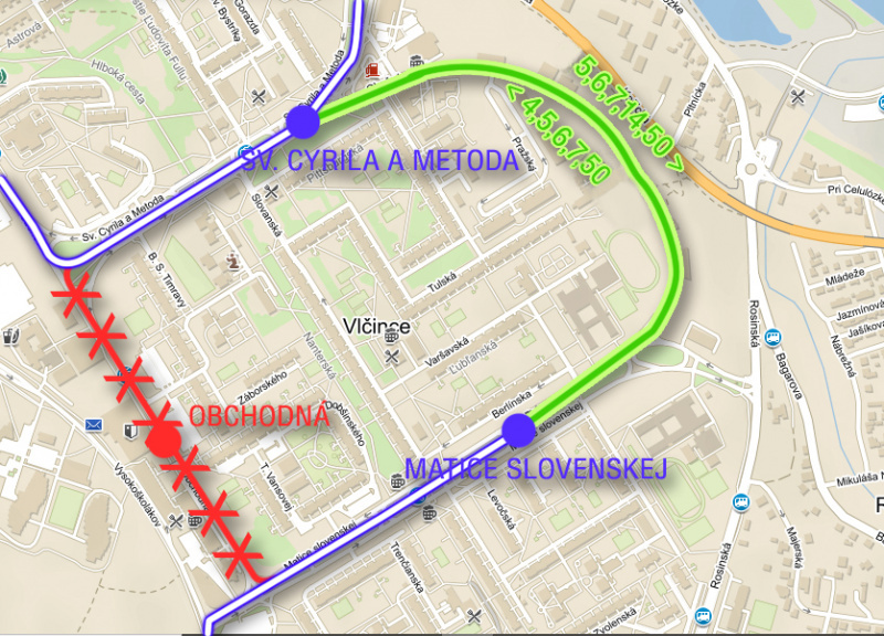 Z tohto dôvodu budú spoje liniek č. 4, 5, 6, 7, 14 a 50 zo zastávky "Sv. Cyrila a Metoda" v smere "Matice slovenskej" (resp. "Matice slovenskej" v smere "Sv. Cyrila a Metoda" ) vedené odklonom, po ul. Obežná, mimo zastávku "Obchodná".